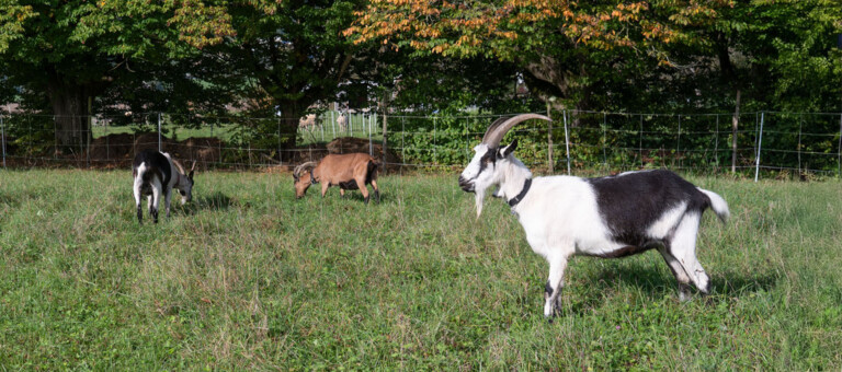 Die grossen Bergziegen haben bei uns ein abwechslungsreich gestaltetes Gehege mit Klettermöglichkeiten, Futter- und Liegebereichen, einen Stall und einen Anhänger wo sie drin schlafen können. Wir gehen regelmässig mit ihnen spazieren. Da können sie neue Eindrücke sammeln und überall am Weg- und Waldrand etwas Feines stibitzen. Zudem dürfen sie täglich auf eine Weide zum Grasen.